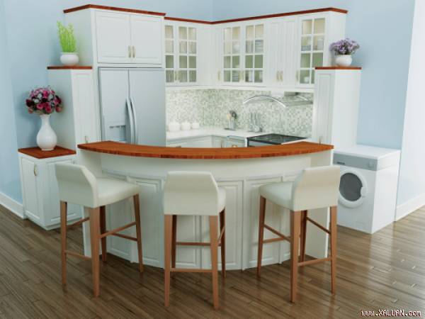 Bếp được thiết kế cập theo tường hình L, kết hợp với bàn đảo hình một phần tư vòng tròn cắt cụt tâm. Phần giữa bàn đảo và bếp tạo nên một lối lưu thông vào và ra bếp. Theo trình tự và xắp xếp như sau:
