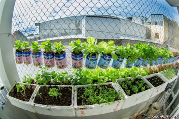 Anh Nguyễn Văn Biển ở Châu Thành, Hậu Giang quyết định dành chút thời gian trồng rau cho con ăn dặm vì thị trấn nơi gia đình sinh sống không có siêu thị bán rau sạch. Vườn rau trên khoảnh lan can chỉ rộng chừng 3,6m2 nhưng hội tụ đầy đủ các loại rau sạch nhờ áp dụng phương pháp vườn treo - tận dụng lon sữa bột.